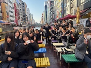 また、2日目のエクスカーションでは上方の出汁文化について学びました。出汁についてあまり知識がありませんでしたが、講義を通して美味しい出汁の特徴や魅力を知ることができました。午後の道頓堀リバークルーズでは、水の都と呼ばれる大阪の橋や風景を見学し、街の魅力を改めて感じることができました。