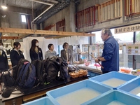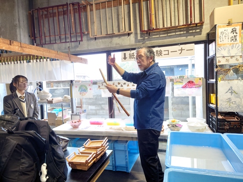 秋には、山川町にある阿波和紙会館にて和紙の歴史を学び、実際、和紙漉き体験もさせていただきました。体験コーナーの隣では、美しい藍染めの和紙や土を混ぜて強度を増した名刺などの製造過程を拝見することもできました。また、職人の方々が原料である三椏を丁寧に加工していく様子など今まで見たことのない阿波和紙の芸術的な作品に生徒達は感動していました。